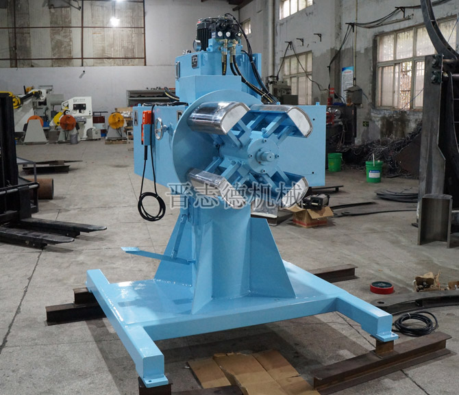 1、晋志德新款油压双头材料架将液压油缸放置于双头材料架顶部,避免开卷时材料与油缸发生干涉。