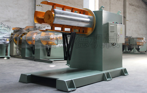 当料卷套装在重型材料架后,油缸在电磁阀的控制下,油缸活塞杆移动带动活动滑块在主轴上移动使托料瓦板伸展(托料瓦板外径变大)此时托料瓦板在料卷内孔中移动的同时把料卷涨紧,达到把料卷涨紧的目的。